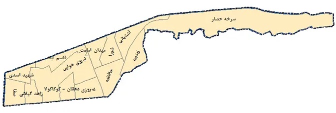 Location of the region: Thirteenth region of Tehran municipality is one of the urban regions of Tehran. This area, which is located in the east of Tehran, is bounded by Damavand Street from the north, Yasini Highway from the east, Pirouzi Street from the south, and Hefdeh Shahrivar Street from the west. This area located in the far eastern part of Tehran city is neighboring with other areas; From the north to four, eight and seven regions (Damavand axis), from the west to Dovazdeh region (17th Shahrivar axis), from the south to Fourdeh region (Piroziz axis) and from the east to Esbadovani highway and Sarkheh Hesar (Harim East of Tehran) is limited. This area is located at latitude 26° 42° 35 North and longitude 35° 29° 51° East. The area of the region is about 12.9 square kilometers, and of this area, about 9.3 square kilometers is urban and the rest is military, industrial, etc.